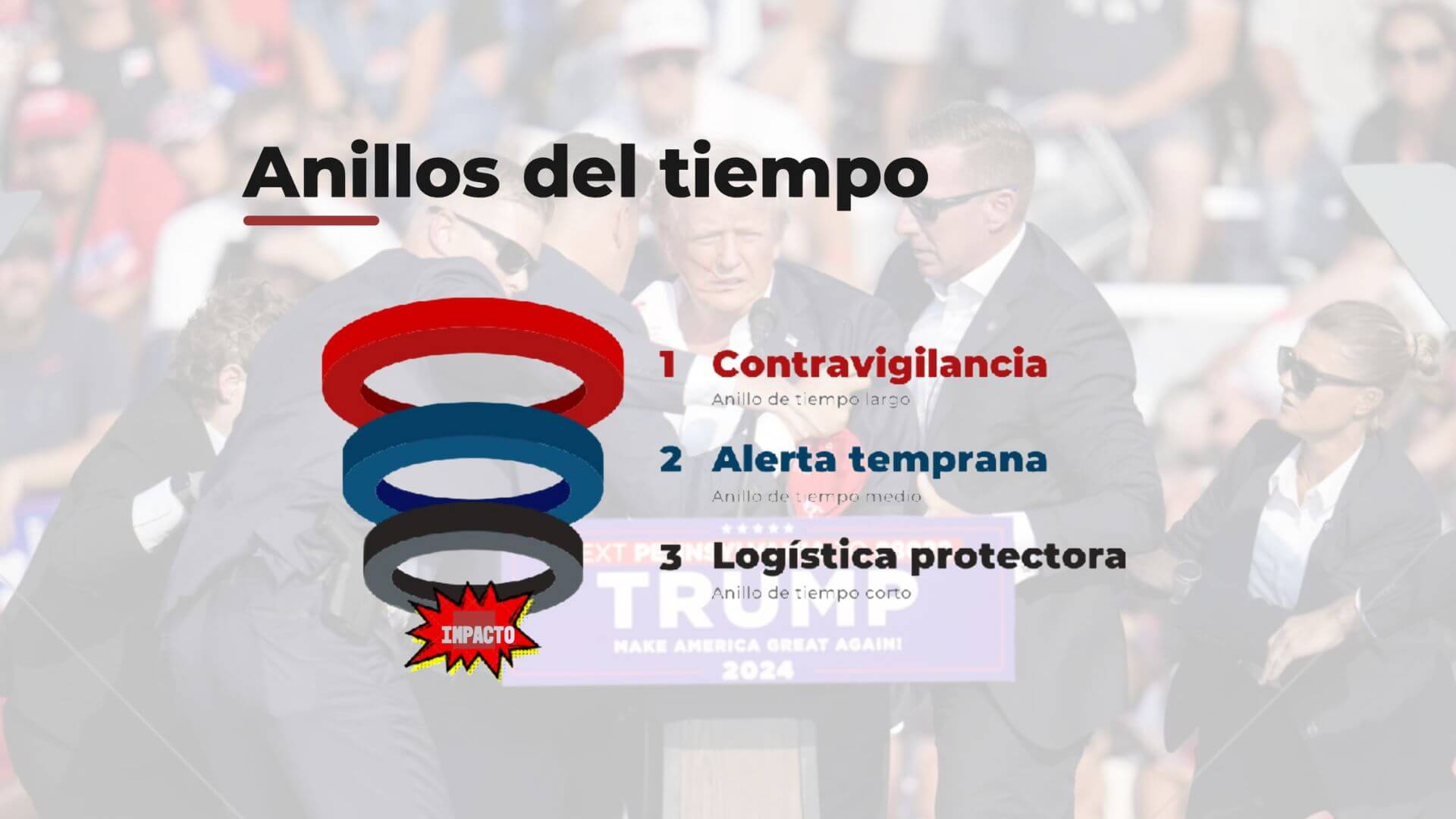 La Alerta Temprana se enfoca en una fase particular de preparación del ataque conocida como el despliegue. Minutos, o en ocasiones, hasta horas antes de un ataque, los delincuentes deben posicionarse en puntos estratégicos. La Alerta Temprana identifica estos lugares y los interviene con anticipación, desactivando el ataque minutos antes de que ocurra. En el primer atentado contra Donald Trump en julio de 2024, el agresor fue visto posicionándose en puntos estratégicos mucho antes del ataque. Sin embargo, los agentes del Servicio Secreto no vigilaron estos puntos oportunamente, perdiendo así la oportunidad de frustrar el ataque en su fase temprana. Sin embargo, en el segundo atentado, solo dos meses después, los agentes aprendieron la lección. Identificaron estos puntos estratégicos y los intervinieron con anticipación, varios minutos antes de que el protegido estuviera en la mira del agresor. De esta manera, lograron desactivar el ataque lejos de Trump, tanto en tiempo como en espacio, sin que esto representara ningún peligro para el republicano. Por su característica de detener un ataque con minutos u oras de anticipación lo llamamos el Anillo de Tiempo Medio.https://youtu.be/cIHKD7wkRFY?si=0thyLjdYad8bsX52
